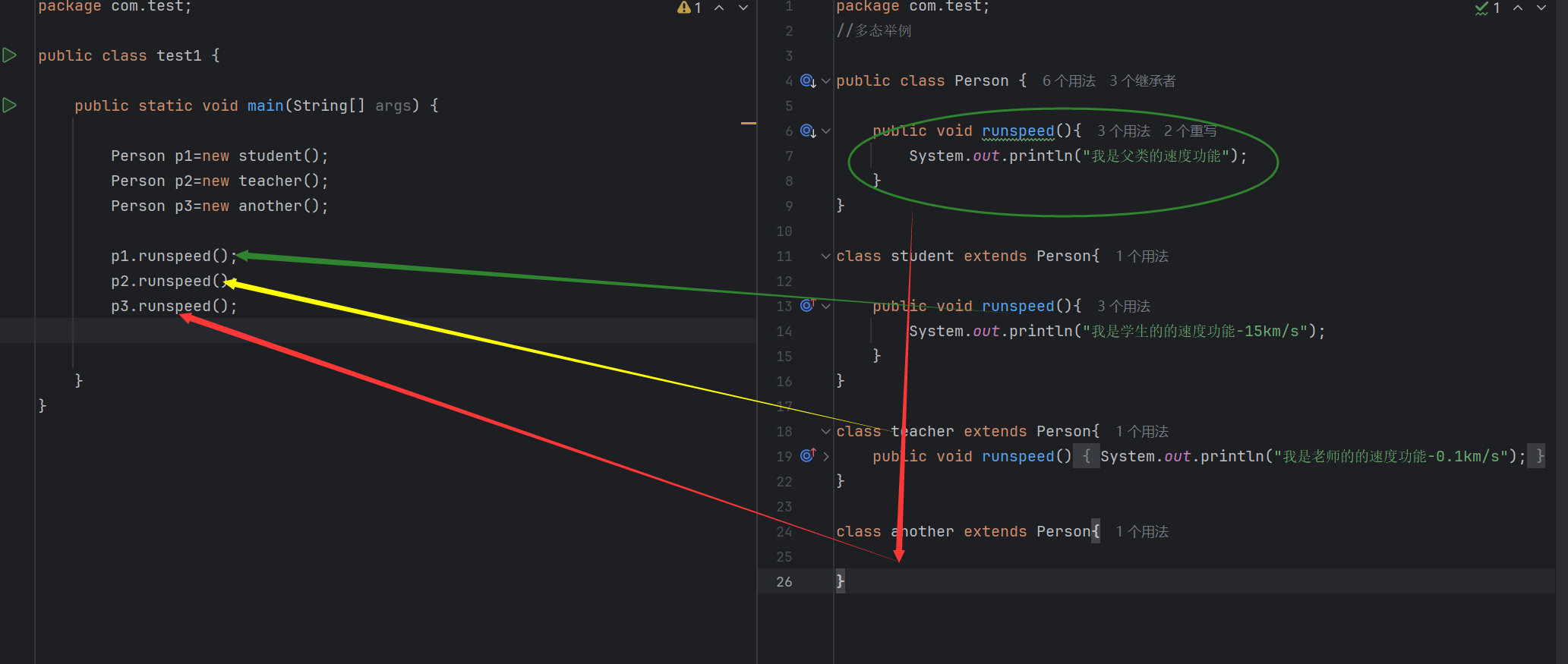 多态访问权限:对于成员方法:如果子类有重写该方法,看子类的成员方法多态是在继承/实现的一种现象,比如父类有这个方法,子类没有,那么就调用父类的,如果子类有重写该方法,那么就调用子类重写该方法; 比如上面这个例子就是,p1和p2在子类重写该方法了,就使用它...